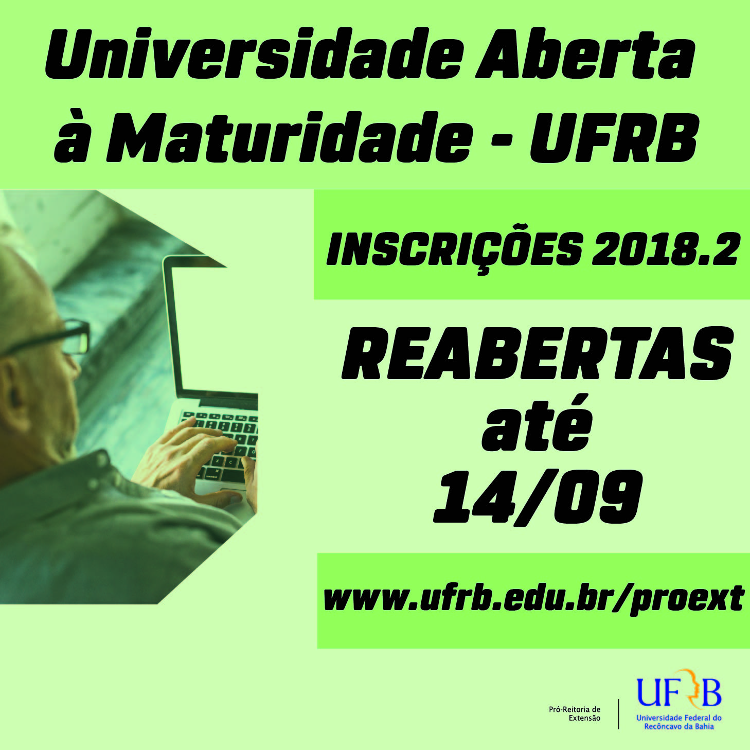 A Pró-Reitoria de Extensão da Universidade Federal do Recôncavo da Bahia, reabre as inscrições para o Edital Nº 09/2018 – Oferta de vagas do Programa Universidade Aberta...