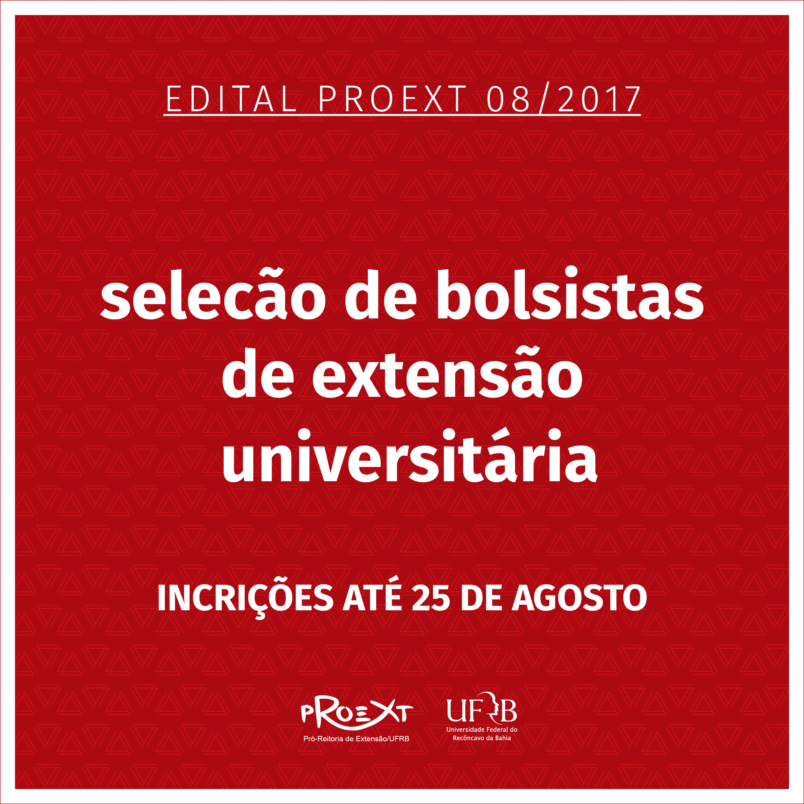 A Pró-Reitoria de Extensão (PROEXT) da Universidade Federal do Recôncavo da Bahia (UFRB) publica o Edital 08/2017 - chamada para seleção de bolsistas de extensão...
