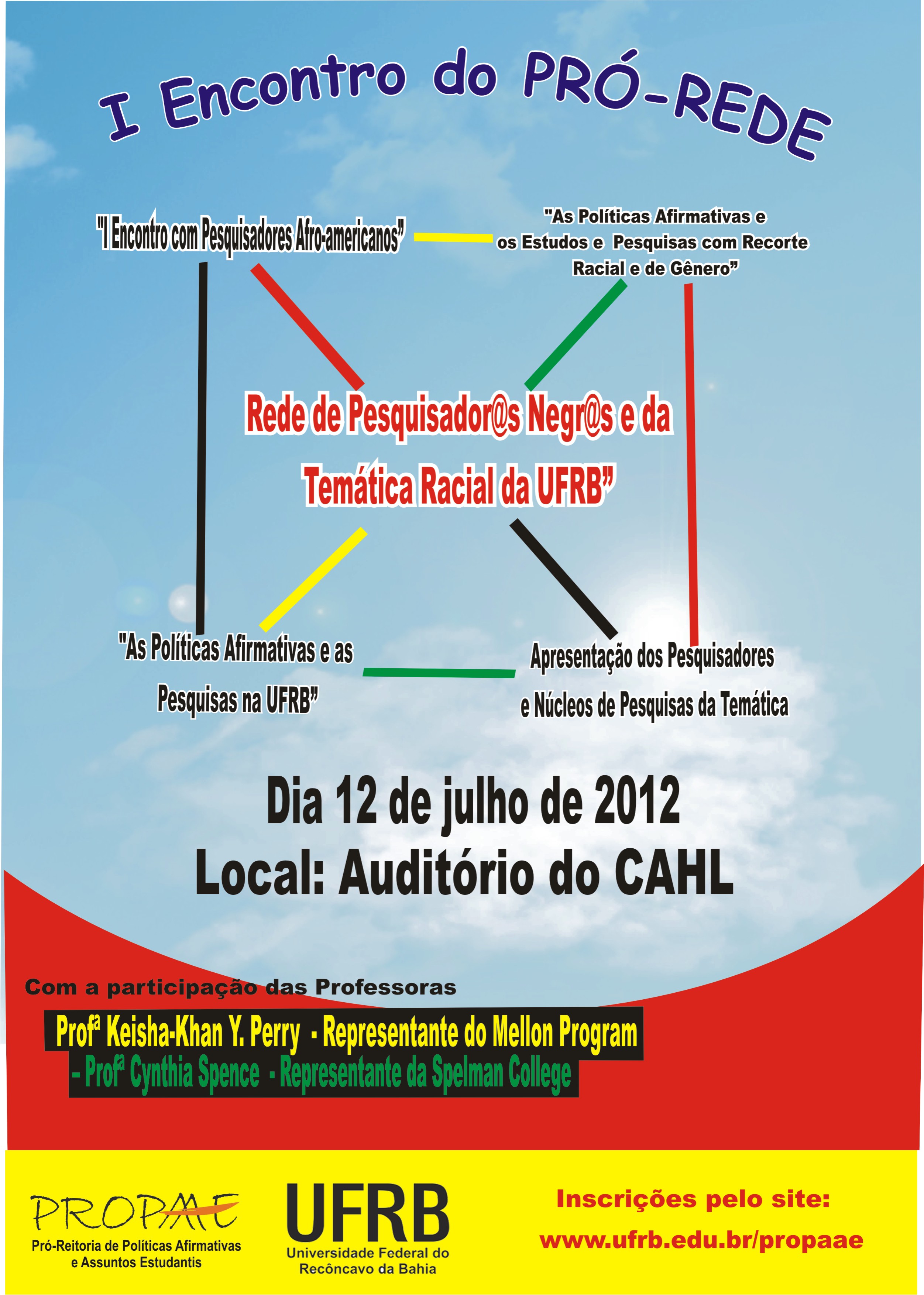 Assim, a PROPAAE convida os pesquisadores e Núcleos de Pesquisas da UFRB, vinculados a essa temática, para participarem do “I Encontro do Pró-rede: Rede de Pesquisador@s Negr@s e da Temática Racial da UFRB”, que será realizado no dia 12 de julho de 2012, no auditório do CAHL, em Cachoeira, com o propósito de aprofundarmos as discussões, levantarmos propostas de funcionamento e os demais encaminhamentos necessários para fazermos funcionar efetivamente nossa rede.