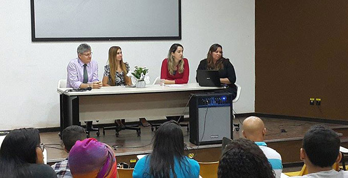 Logo após, ocorreu a apresentação de trabalhos de estudantes da UFRB. Tendo como tema doação de órgãos, a equipe formada por Adriano Rivera, Fernanda Barbosa, Gustavo Cerqueira e Reinaldo Silva apresentou o processo de criação do trabalho Doe órgãos, doe vida. Já sobre o tema violência, os estudantes Cristiane Almeida, Direle da Cruz, Lindauline Moreno e Marcos Vinicius apresentarão o trabalho Monstros existem. Denuncie. Para analisar e comentar sobre os trabalhos apresentados e temas tratados, compôs a primeira mesa redonda intitulada Comunicação e cidadania Dr. Eraldo Salustiano Moura, coordenador do Sistema de Transplantes da Bahia - SESAB, que destacou a relevância de se tratar sobre doação de órgãos, parabenizou a equipe que abordou o tema e discorreu sobre a necessidade de realização de trabalhos desta natureza. Também compôs a mesa que tratou especificamente sobre os números alarmantes de violência contra a mulher, a coordenadora de políticas públicas e ações governamentais da superintendência de prevenção à violência da Secretaria de Segurança Pública do Estado da Bahia, Capitã Maribel Fernandes Ribeiro Santana, que é graduada em Administração pela Universidade do Estado da Bahia, tem Especialização em Metodologia do Ensino Superior e Gestão de Projetos e mestra em Administração. A capitã Maribel analisou detidamente o trabalho apresentado, destacando a necessidade de se educar a população, no sentido de que as pessoas compreendam a gravidade de atos que às vezes destroem famílias e até vidas e parabenizou a equipe pela escolha do tema e iniciativa. Para comentar sobre os laços entre comunicação e os temas abordados, ainda compôs a mesa a mestra em Cultura e Sociedade(UFBA) Hanayana Brandão, que é professora da UNEB, FTC e UNIBAHIA. Em suas reflexões, Hanayana destacou a importância do estreitamento de vínculos entre a Universidade e a sociedade e parabenizou as equipes. A mediação desta mesa ficou a cargo da professora da UFRB Juciara Nogueira, Doutora em Cultura e Sociedade (UFBA).