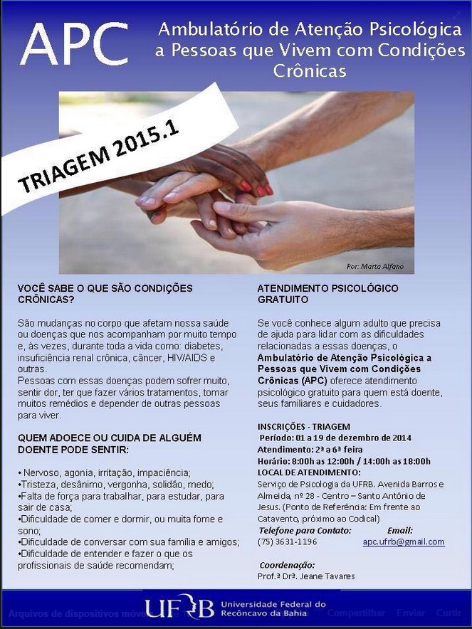O Ambulatório de Atenção Psicológica a Pessoas que Vivem com Condições Crônicas (APC), vinculado ao Centro de Ciências da Saúde (CCS) da Universidade Federal do Recôncavo da Bahia (UFRB), realiza triagem para atendimento psicológico gratuito no período de 01 a 19 de Dezembro de 2014. As vagas são para adultos que precisam lidar com as dificuldades relacionadas a doenças crônicas.