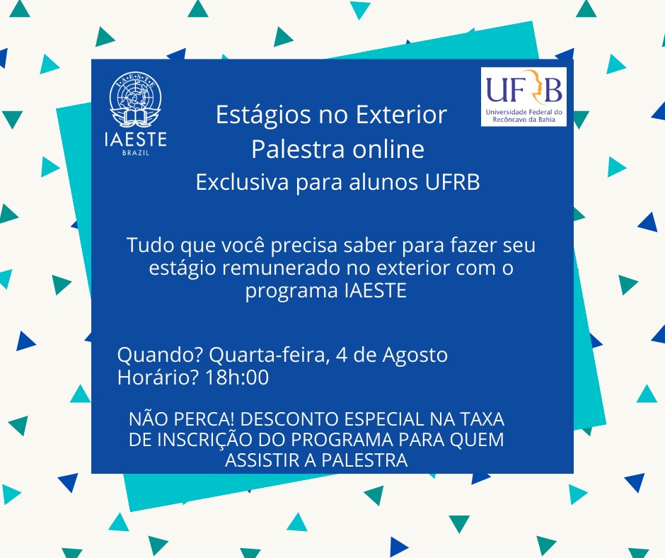 A Superintendência de Assuntos Internacionais (SUPAI/UFRB) convida os(as) estudantes da UFRB para a Palestra online sobre Estágios no Exterior, com Renata Sztokbant, Gerente de Mobilidade Internacional da ABIPE e Secretária Nacional do programa IAESTE: